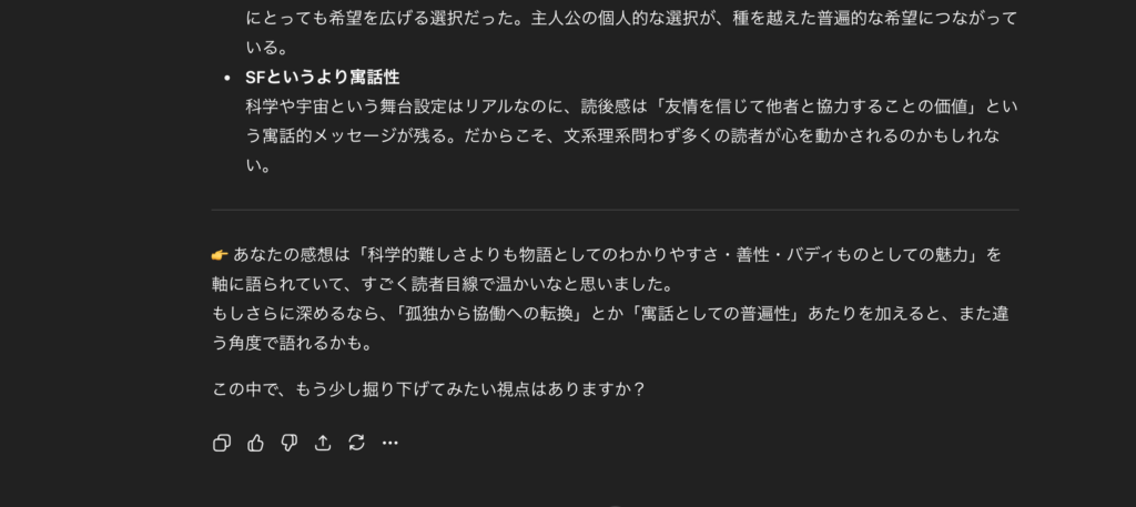 AIを使うことで、自分自身にも発見があって面白かった。適した作品があったら、また文学談義やってみよう。
