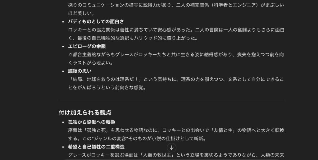これだけ有名作品であれば、感想をChatGPTと語り合えるんじゃないかと思って試してみたら、案の定うまくいきました。(同じ時期に読み終わった「ブレイクショットの軌跡」でも試してみたけど全然うまくいかなかった。日本の小説は文豪の作品など、考察が多いもの以外は文学談義は難しそう)